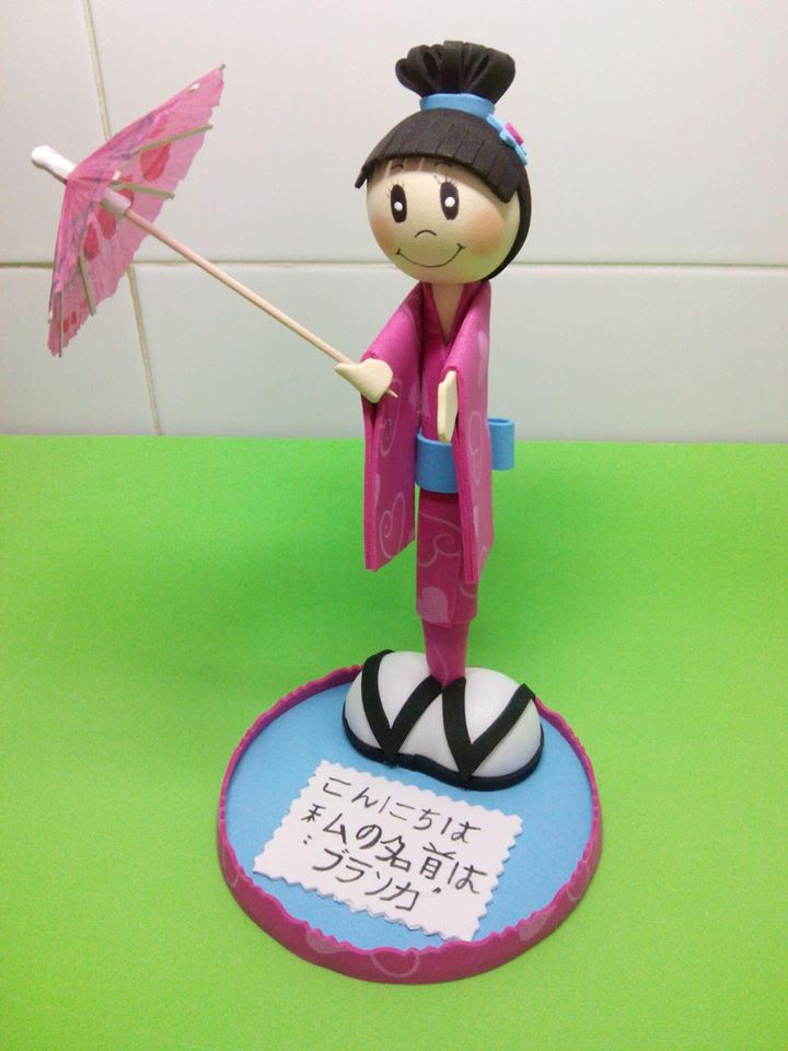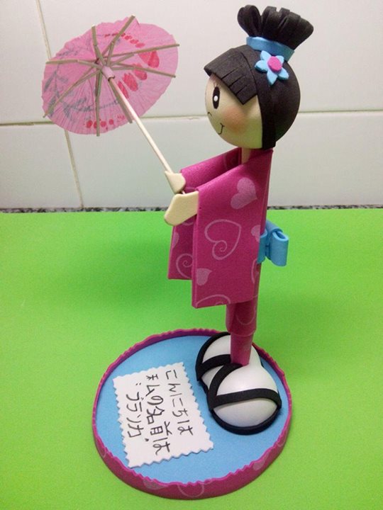 Fofuboli de gheisa con paraguas y en japones está escrito "Hola, me llamo Blanca".