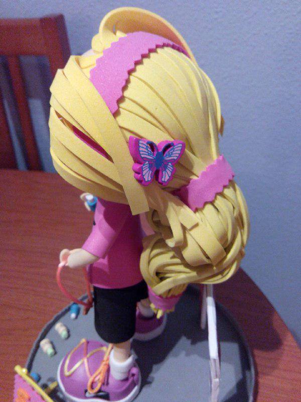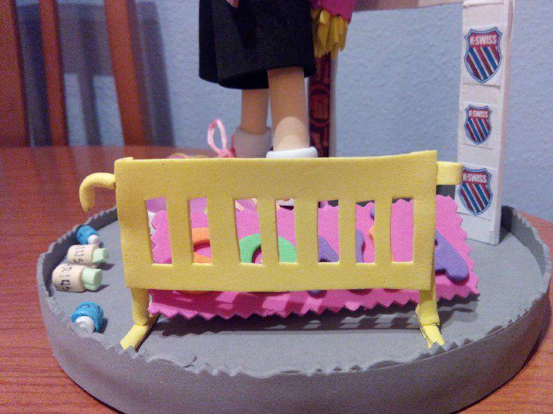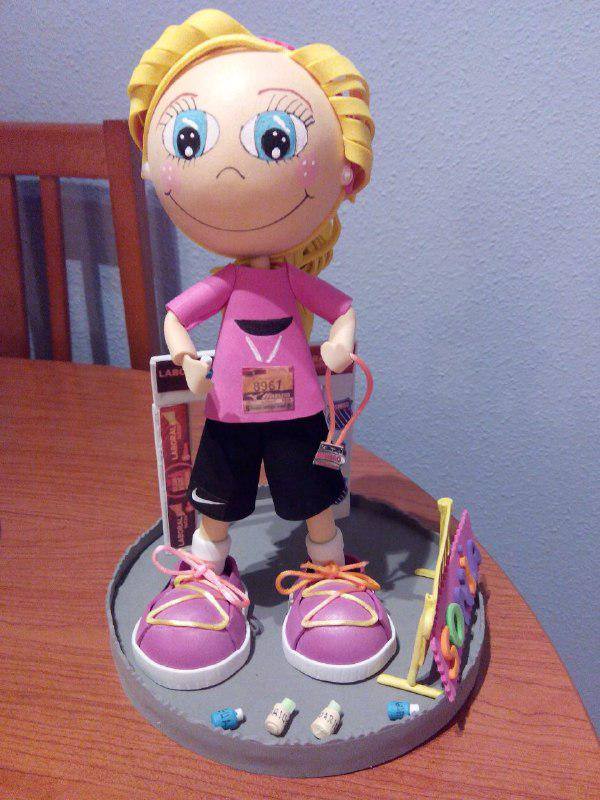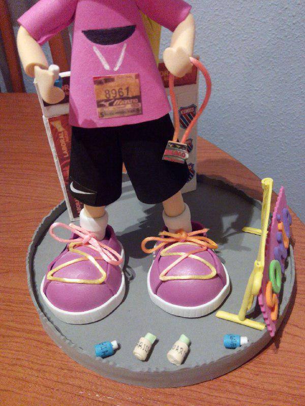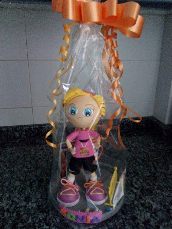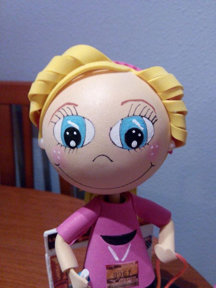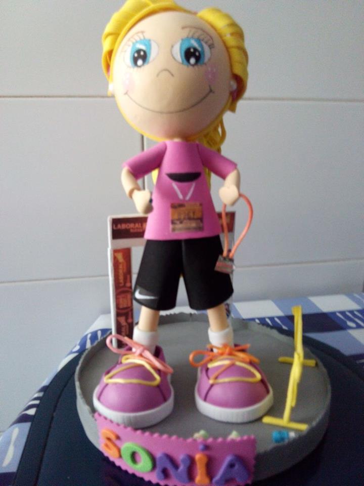 Fofucha de una corredora con detalles (meta, valla para espectadores, botellas de agua, dorsal y medalla de finisher), pelo recogido y pendientes. He tratado de hacerla lo más idéntica posible (uniforme y zapatillas).